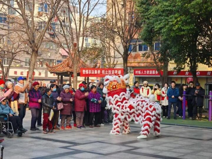 实践团队将党的二十届四中全会精神与文化强国建设目标巧妙融入展演全过程,用“青言青语”讲活“国之大者”。舞狮间隙,志愿者结合表演向社区居民介绍:“过年舞狮图个喜庆团圆,可热闹的背后,离不开两个人的默契配合。咱们社区就像一个大家庭,只有人人参与、守望相助,才能真正‘舞’出和谐、‘狮’意满满!”。在“中国结”教学时,队员一边示范编织方法,一边引导大家感悟文化内涵:“中国结为什么叫‘结’?因为它讲究团圆、讲究联结。中华大地上56个民族交融共生,就像这红绳,越缠越紧,越结越亲——这就是咱们文化的根,也是未来的路。”